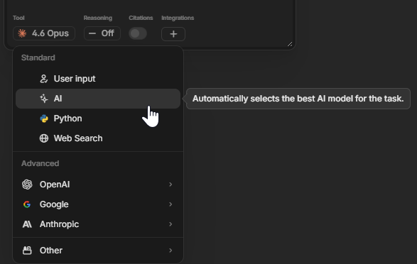 Begin with a smaller model for early development and straightforward tasks. These models are typically sufficient for prompt iteration, simple transformations, and initial workflow configuration.- Good for: initial scaffolding, prompt experimentation, and simple transforms.