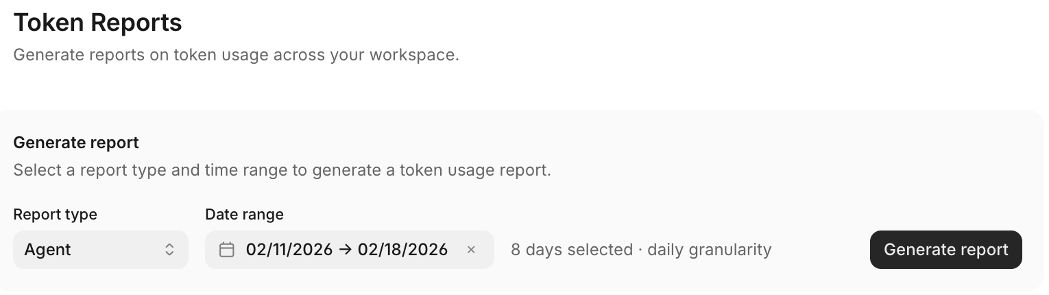 Generate and download detailed AI token usage reports for your workspace. Track usage by agent, hub, chat, or get a summary view.