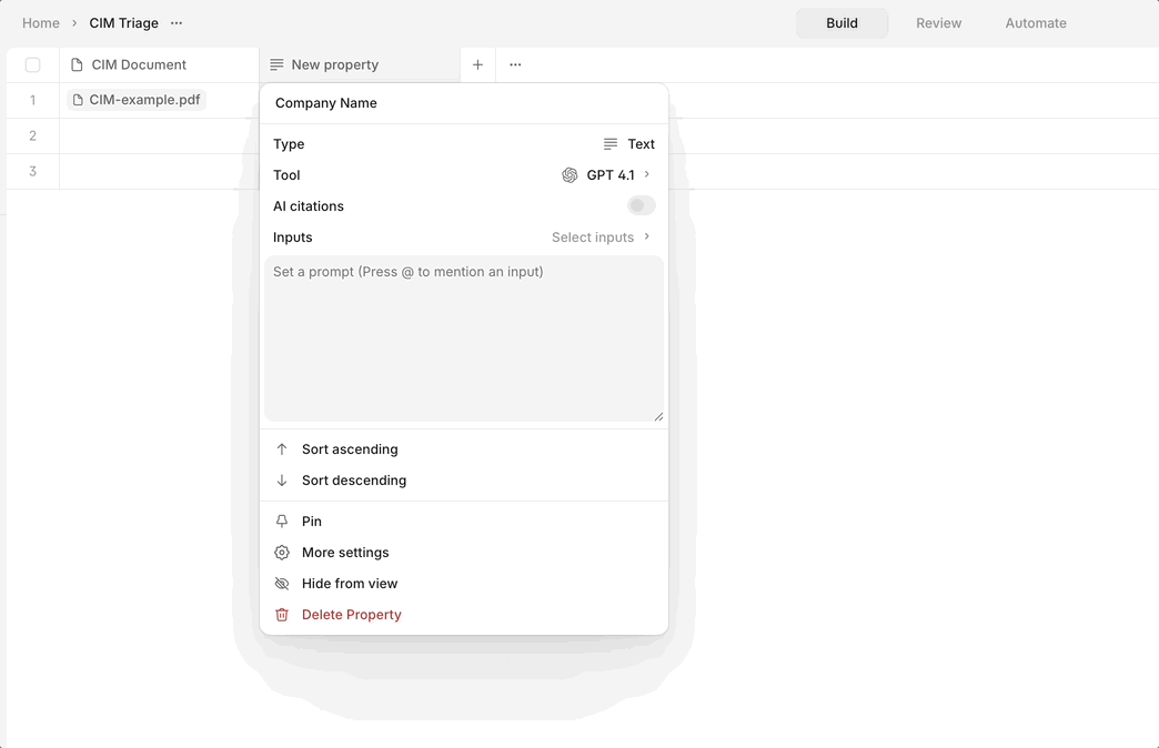 In this example, we'll show how to set up a text property to extract the company name from the CIM document you uploaded earlier.