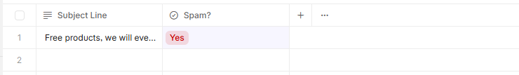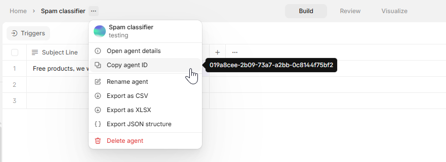 Starting off, you'll either create a new Agent (project) or choose an existing one to work with. For the purpose of this guide, our focus will be on adding an entity to a straightforward Email Spam classifier Agent. This classifier is designed around two properties: 'Subject Line' and 'Spam?'. You can input subject lines either programmatically or manually. Once entered, the system evaluates each subject line to determine whether it is considered spam.